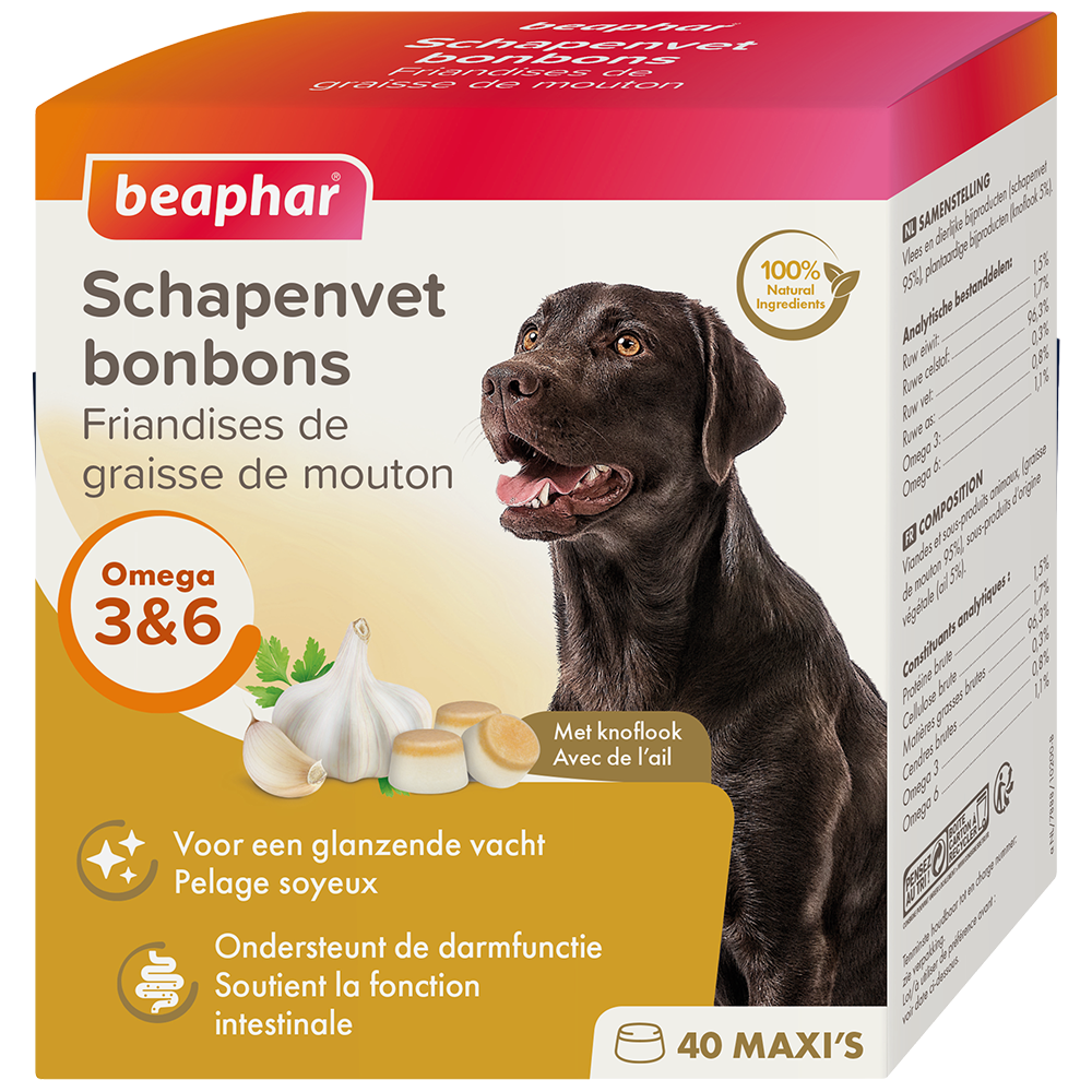 De Beaphar Schapenvet Bonbons zijn 100% natuurlijke hondensnacks op basis van schapenvet, verrijkt met 5% knoflook. Dankzij dit rijke vetgehalte leveren ze waardevolle omega 3-, omega 6- en omega 9-vetzuren, die een glanzende vacht ondersteunen en huidconditie bevorderen. Daarnaast dragen ze bij aan een gezonde spijsvertering. Schapenvet bonbons zijn ideaal als supplement naast de normale voeding.