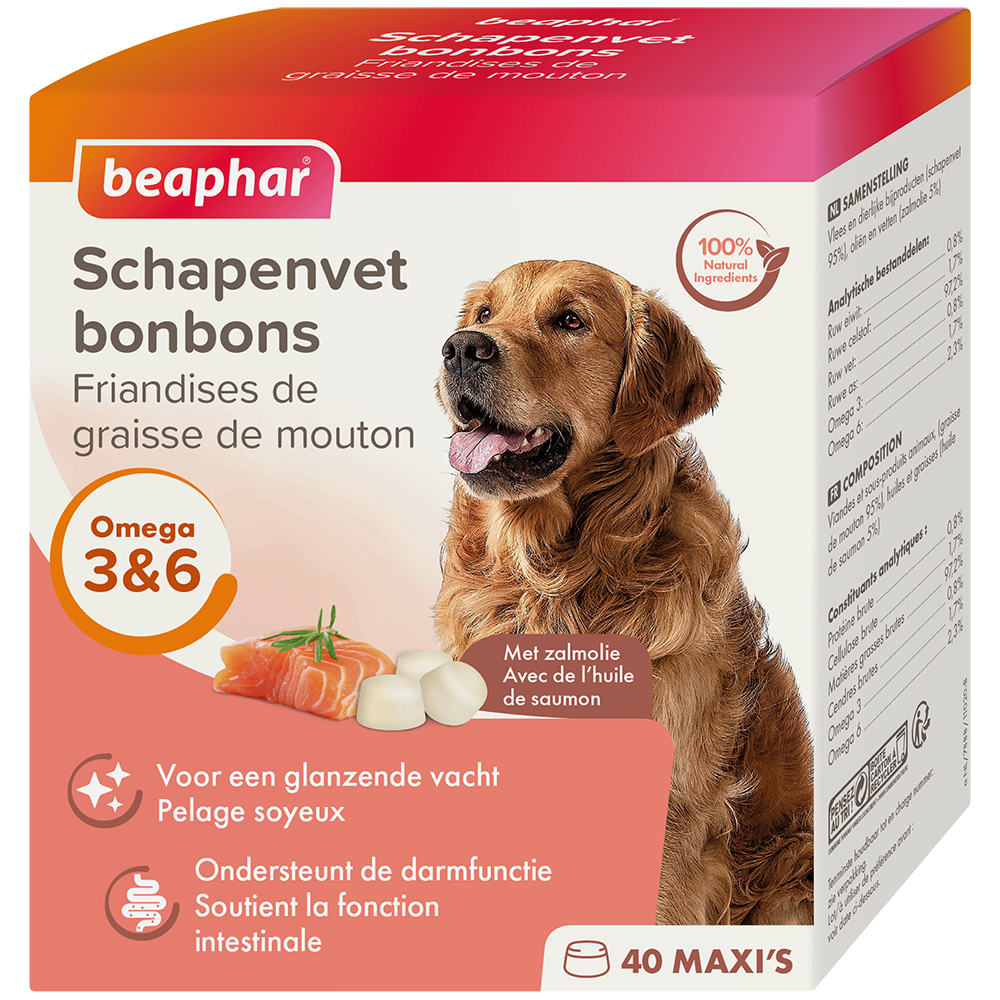 De Beaphar Schapenvet Bonbons Zalm zijn natuurlijke hondensnacks gemaakt van ca. 95 % schapenvet en 5 % zalmolie. Ze combineren de voedende kracht van vetten met de voordelen van omega-3 en omega-6 vetzuren die bijdragen aan een glanzende vacht en een gezonde huid. Deze bonbons worden vaak ingezet als supplement naast de dagelijkse voeding, met ondersteunende eigenschappen voor de spijsvertering.