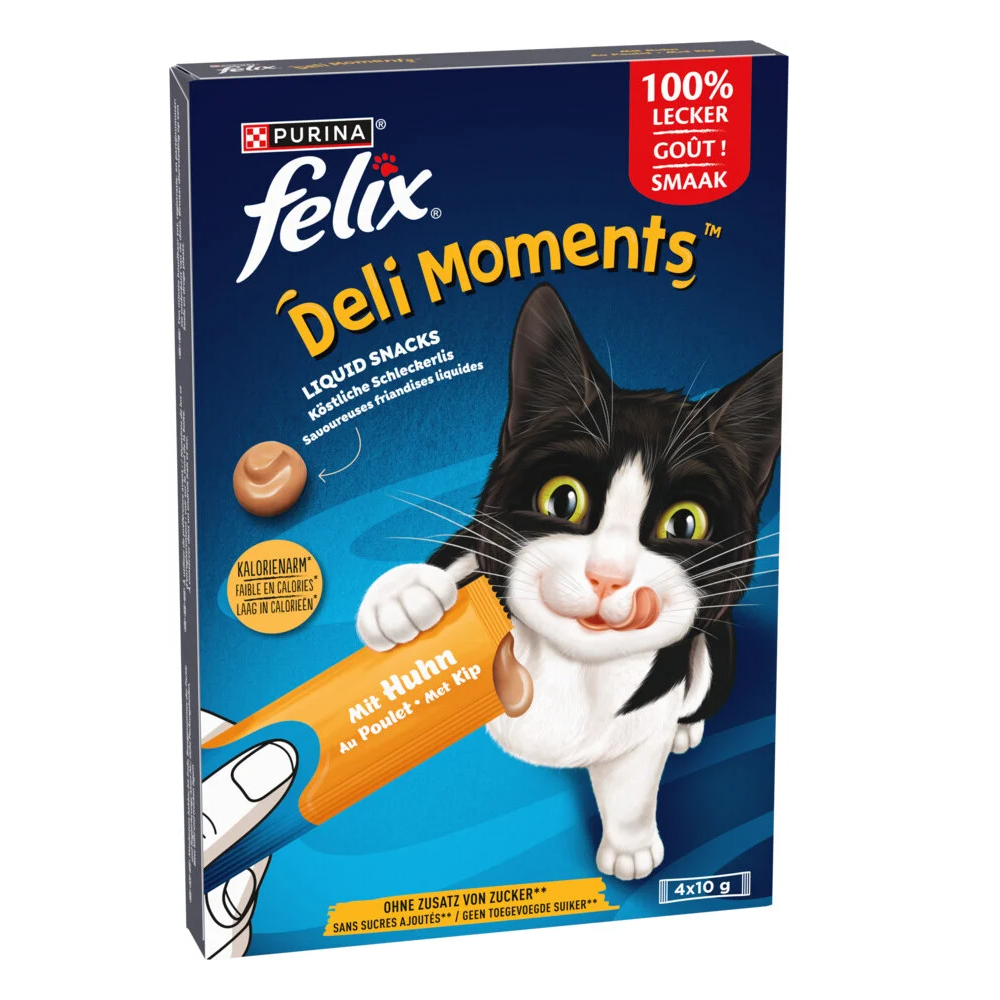 De Felix Deli Moments Kip is een vloeibare snack met een sterke kipsmaak. Wat dit product bijzonder maakt, is dat je het op verschillende manieren kunt geven: rechtstreeks uit het zakje, in het voerbakje of als topping over brokjes om deze extra aantrekkelijk te maken. Je kunt het ook direct uit de hand aanbieden. Daarnaast kun je de snack invriezen zodat je kat op warme dagen een verkoelende traktatie krijgt.
