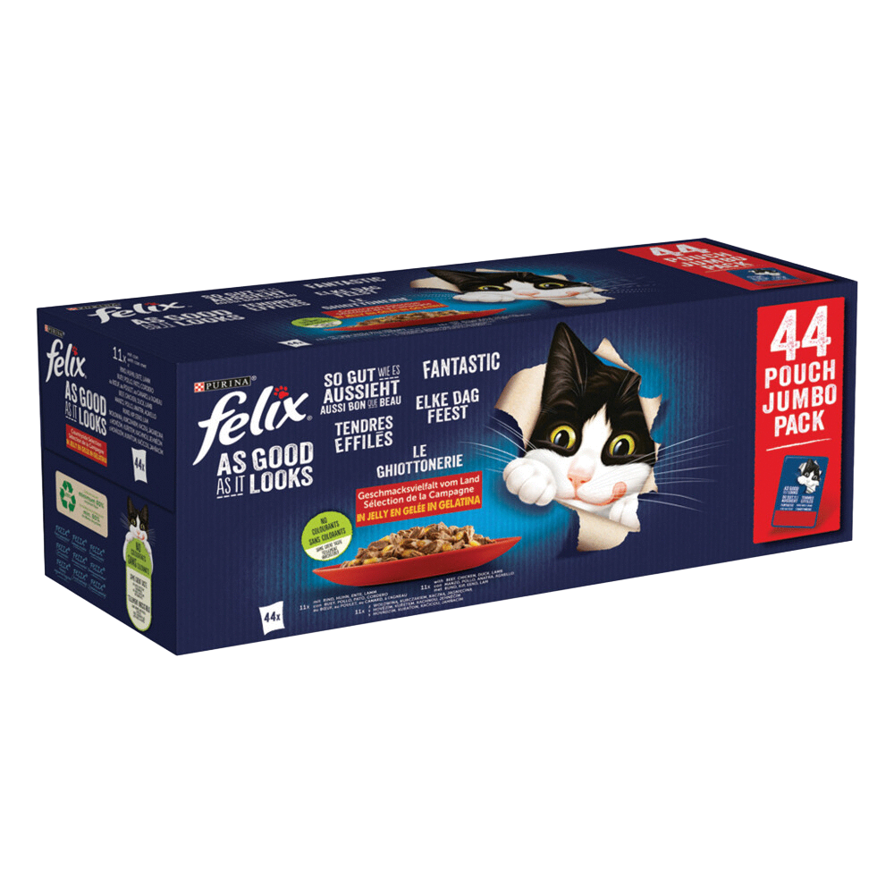 De Felix Elke Dag Feest Zo Goed Als Het Eruit Ziet 44 × 85 g biedt jouw kat elke dag afwisselende, smakelijke maaltijden in gelei. Dit Felix EDF multipack bevat landsmaken zoals kip, rund, eend en lam.