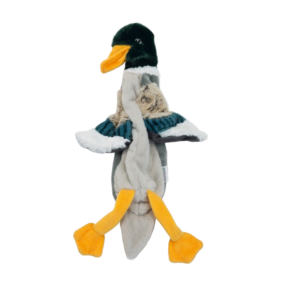 De speelse vorm en zachte vulling maken de Flatino Duikeend goed geschikt als knuffel voor binnen in huis.  Dit hondenspeeltje is 30 cm lang.