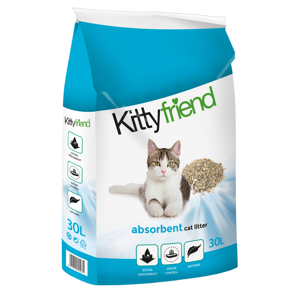 KittyFriend Absorbent 30 l is een budgetvriendelijke kattenbakvulling. Deze kattenbakvulling is gemaakt van klei wat een hoog absorptievermogen heeft. Daarnaast helpt deze natuurlijke klei ongewenste geuren voorkomen.