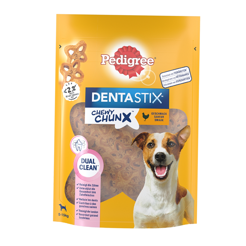De Pedigree Dentastix Chewy Chunx zijn gebitsverzorgende kauwsnacks in mini-formaat, speciaal ontwikkeld voor honden van ongeveer 5 tot 20 kg. Dankzij de unieke X-vorm en actieve ingrediënten helpen ze tandplak te verwijderen terwijl je hond knabbelt. De snack bevat minder dan 2 % vet per 100 g en is vrij van toegevoegde suikers, kunstmatige kleur- en smaakstoffen.