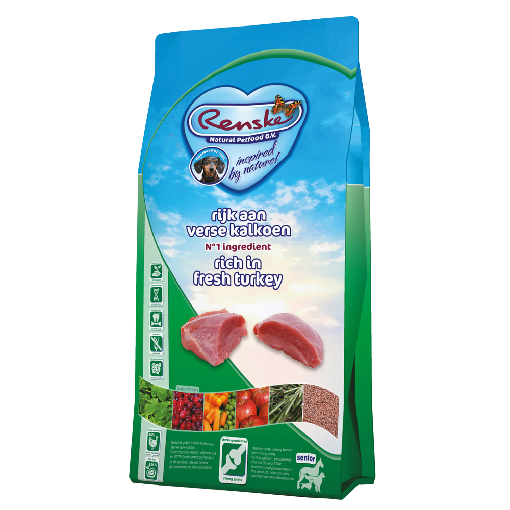 Renske Super Premium Senior Kalkoen Graanvrij is een complete, licht verteerbare hondenvoeding die speciaal is samengesteld voor oudere honden van alle rassen en honden met een lagere activiteit.