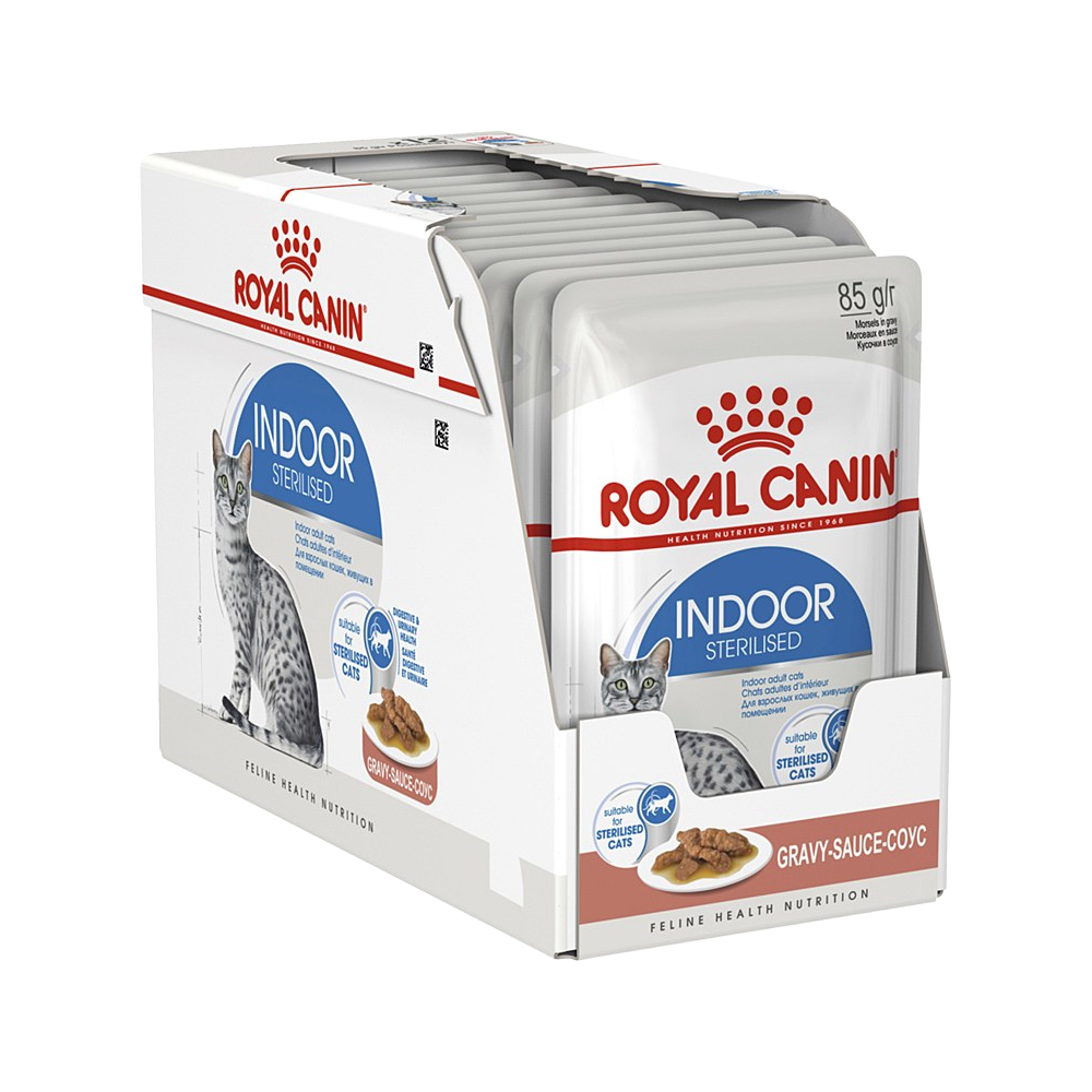 Royal Canin Indoor in Gravy is natvoer afgestemd voor de binnenkat. Deze formule ondersteunt het gewicht, spijsvertering en urinewegen.