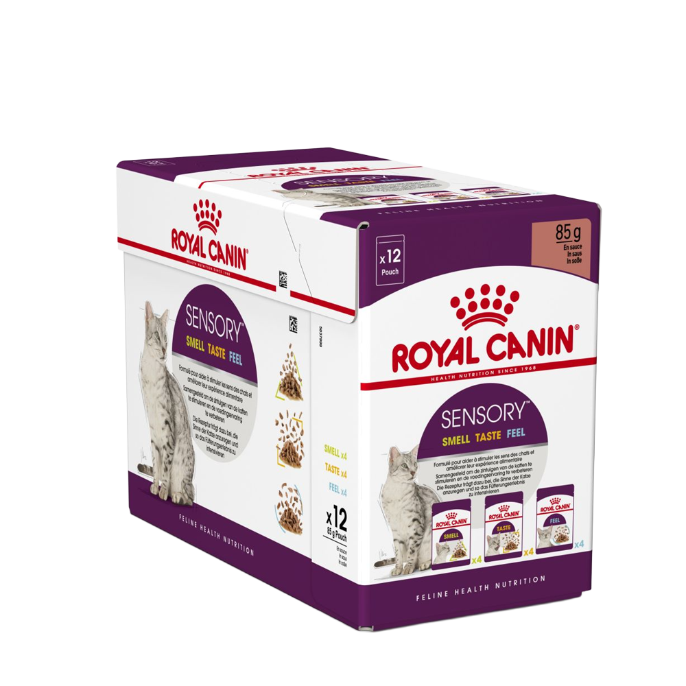 De Royal Canin Sensory Multipack in Gravy bevat 12 portiezakjes natvoer (elk 85 g) met drie verschillende varianten die speciaal ontworpen zijn om de zintuigen van katten te prikkelen: geur, smaak en mondgevoel. Elke variatie (Smell, Taste, Feel) heeft een eigen recept en textuur, zodat je kat elke maaltijd een andere beleving heeft. De stukjes vlees in saus zorgen voor sappigheid, en de formule is uitgebalanceerd met een zorgvuldige selectie van ingrediënten om tegemoet te komen aan de behoeften van volwassen katten.