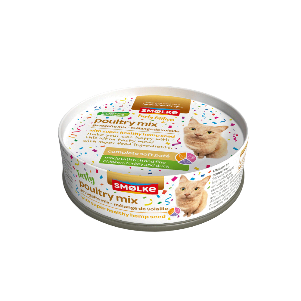 De Smølke Soft Paté Kat Party Edition 80 g is een een luxe pat natvoeding met kip, kalkoen en eend als dierlijke eiwitbronnen. Dankzij de romige patétextuur is het ideaal voor katten die moeite hebben met harde brokjes of een gevoelige mond hebben. Smølke gebruikt enkel natuurlijke ingrediënten en laat kunstmatige geur-, kleur- of smaakstoffen achterwege.