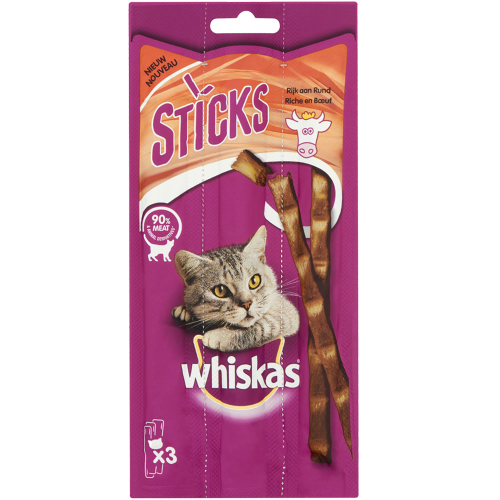 De Whiskas Catsticks combineren krokante buitenkant, zachte kern en aantrekkelijke vleessmaken in een snack die je kat telkens weet te verleiden. Door de individuele verpakkingen en breekpunten zijn ze handig, vers en eenvoudig te doseren.