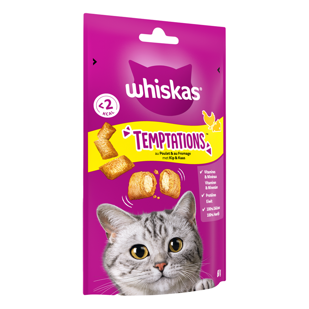Whiskas Temptations combineert krokant en zacht in één snack, een ware traktatie. Dankzij slimme verpakking en verrijking met vitamines biedt het voer een smakelijke én verantwoorde traktatie.